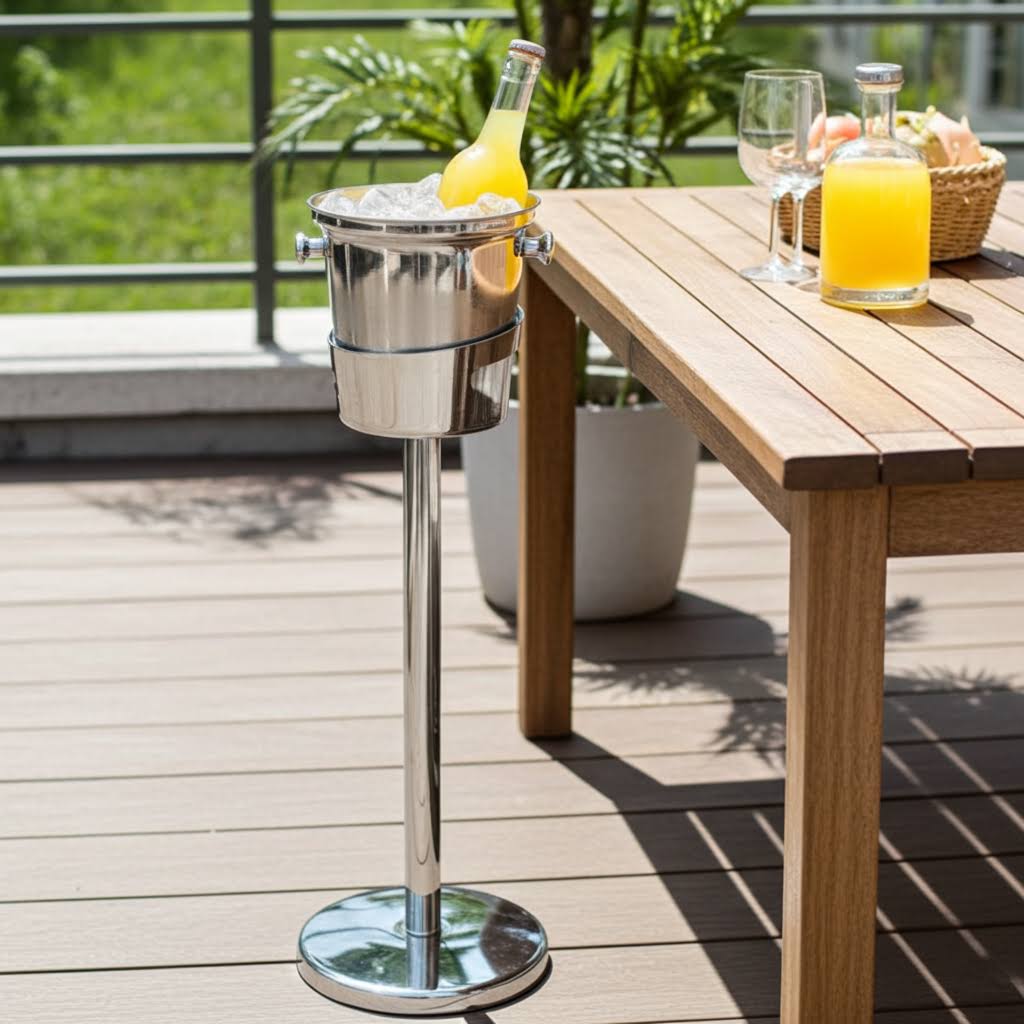 Denne elegante metal champagnekøler på stander kombinerer stil og funktionalitet, perfekt til enhver festlig lejlighed. Hold din champagne iskold og imponer gæsterne med et tidløst design.