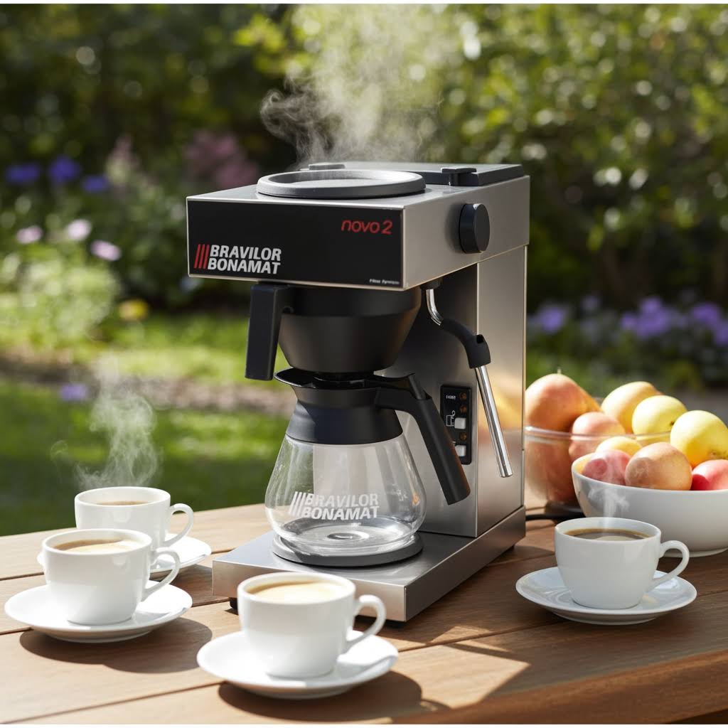 Den kan brygge god og hurtigt filterkaffe til hele festen, caféen, restauranten eller værkstedet. På blot 5 minutter brygger maskinen 1,8 liter kaffe (svarende til 12 kopper kaffe). Bonamat er forsynet med 2 varmeplader, der har automatisk temperaturjustering afhængig af mængden af kaffe i kanden, så den giver dig den optimale temperatur på kaffen.