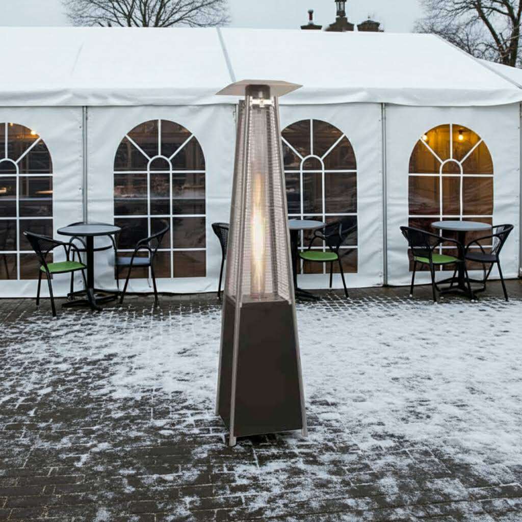 Fritstående Terrassevarmer i rustfri stål. Terrassevarmer med levende flamme. Nyt design med rustfrit stålgitter og plader. Desuden er Plus modellen med et mere effektivt brænde hoved, som giver en bedre varme. Terrassevarmeren er unik med den levende flamme som udover at varme er flot at se på. Terrassevarmeren har elektronisk tænding og varmeregulering.