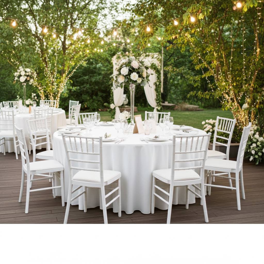 Rundt bord i plast udlejes, bord er med plast bordplade og med metal stel, der kan foldes ind under bordplade. Bord kan bruges udendørs.